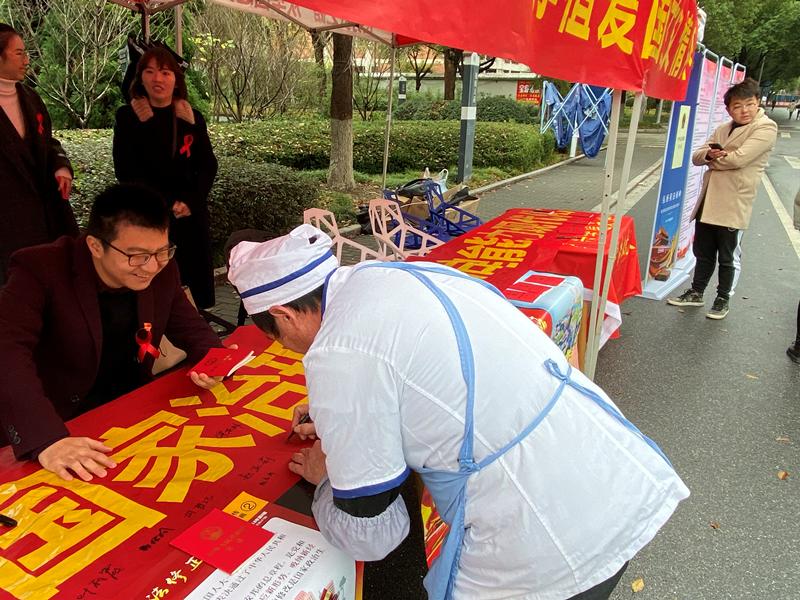 法学专业师生党员、嘉兴市律师协会的律师们共同携手“为宪法站台、发声”。活动中,法学师生党员和律师们向过往行人介绍和普及宪法知识,并发放宪法宣传资料。最终,活动共发放宪法文本40本,参与活动的老师同学纷纷在横幅上签名。