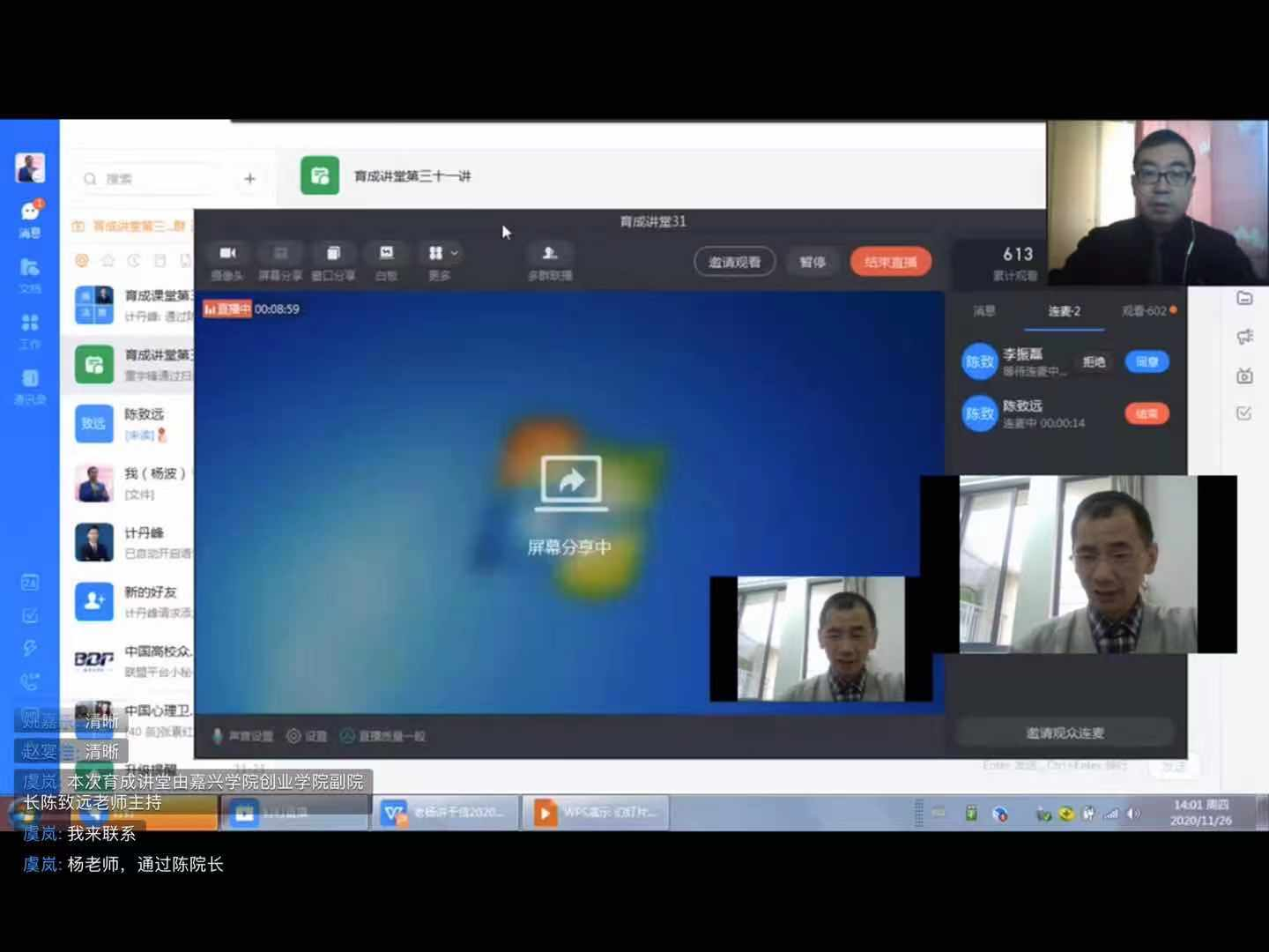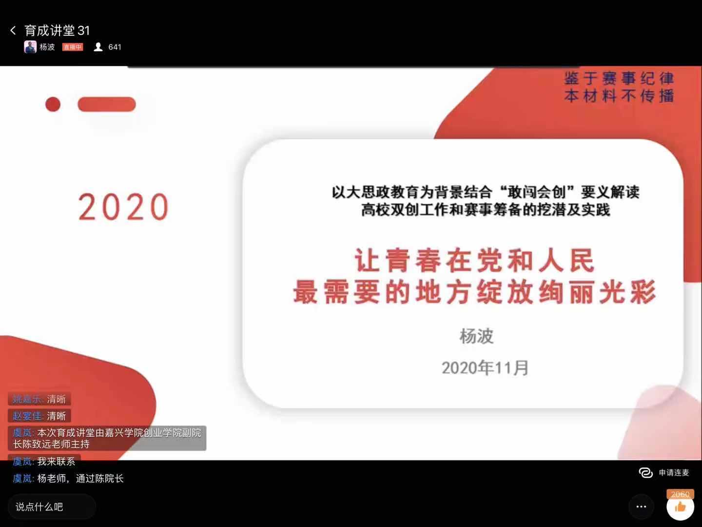 通过钉钉直播的方式与杨波老师取得连线。杨老师从“为啥而干——谈谈各类国赛”“要怎么干——认识‘互联网+’各赛道做好项目筛选”“如何干好——评审的视角及如何备赛”“他山之石——优秀项目案例及互动”等四个方面展开,从“互联网+”与“挑战杯”的比较阐述“互联网+”大赛的不同之处,即关于本质思维、价值思维、教育思维、规则思维、成功思维的分异,并向同学介绍大赛评委视角下的优秀项目案例与备赛思路。同时,他对第七届大赛进行了宏观形势分析与研判,从整体上对大赛的发展形势尤其是未来与嘉兴学院学子相关的“红色赛道”的发展趋势,以及作为嘉兴学院学子应该如何来准备和利用好得天独厚的红色资源。