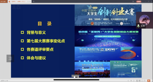 又组织教师参与线上讲座,讲座由中国国际“互联网+大学生创新创业大赛”国赛评委张为老师讲授。讲座主要探讨了如何寻找适合学生参赛的高质量项目。其中提到,好的路演稿要包括目标市场、未来愿景、现状、解决问题等。通过这两次讲座,指导老师们对指导大赛有了直观的概念,激发了教师参与竞赛的积极性,将更好地服务学科竞赛。