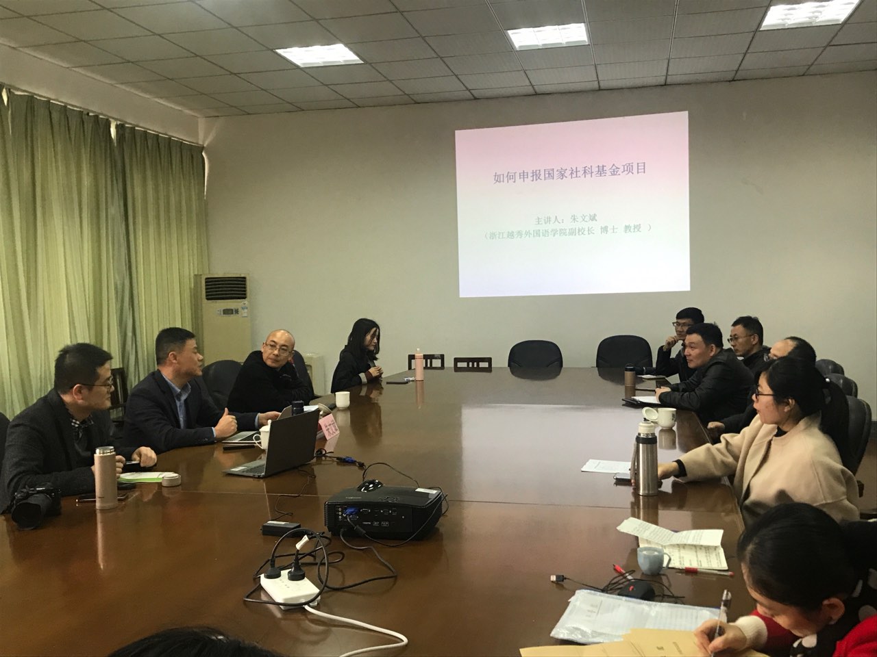 2020年11月26日下午,浙江越秀外国语学院副校长朱文斌应邀到秀人网 作题为“如何申报国家社科基金项目”的交流辅导会。此次辅导会在梁林校区一号楼426会议室举行。朱校长主要从课题申报的概况、相关的注意事项、如何填报申请书以及自己的心得体会等方面阐述了如何才能在国家社科基金项目的申报过程中取得成功。参会教师纷纷表示,本次国家社科基金申报辅导会让老师们受益匪浅。