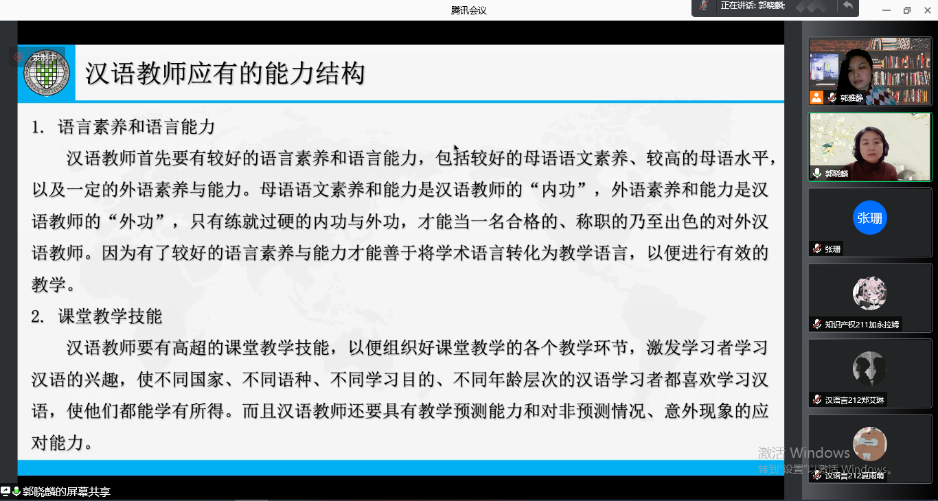 2021129日晚,《汉语教师的素养与常用教学方法》学术讲座在秀人网 成功举办。为了积极配合疫情防控工作,本次讲座通过腾讯会议平台召开。本次讲座邀请了北京语言大学博士生导师郭晓麟教授,留学生教学团队教师,汉教专业、汉语言专业和法律专业学生等70余人参加了讲座。