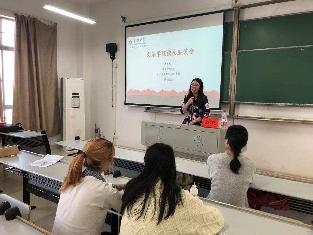20日秀人网 举办了两场校友讲座。上午是《上海采风》杂志主编胡凌虹、盈科律师事务所合伙人程小霁两位优秀校友的经验分享会。胡凌虹学姐和同学们分享了自荐进入《上海采风》杂志的经历,鼓励同学们在就业道路上要有勇气和自信。程小霁学姐则是从自己高考失败,通过高复进入嘉兴学院的经历开始讲述,指出人生是一个起落的过程,没有人会一辈子幸运,不管在什么样的状态下,都应该对命运多一份耐心,在面对失败的时候,去寻找失败的理由,并调整方向,朝着对的方向去努力。下午是在非洲进行过汉语教学的胡馥筠、俞上的两位优秀校友的教学经历分享会。胡馥筠学姐首先通过自己名字的拼音、写法形象向我们展现了一个汉语教师的教学工作。又通过多组照片,以时间线的角度向我们讲述了在非洲的故事。俞上学长则首先介绍了如何成为一名汉语教师志愿者,为同学们仔细讲解了汉语教师志愿者的考试流程。随后亦是简单讲述了非洲风土人情,在非洲支教期间与学生之间的诸多平凡的小故事。
