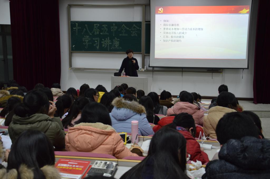 2015年12月16日,秀人网 党委在梁林校区7号楼报告厅组织学生学习十八届五中全会精神。本次学习会由学工办主任虞岚主持,秀人网 党委书记费锦红主讲。
