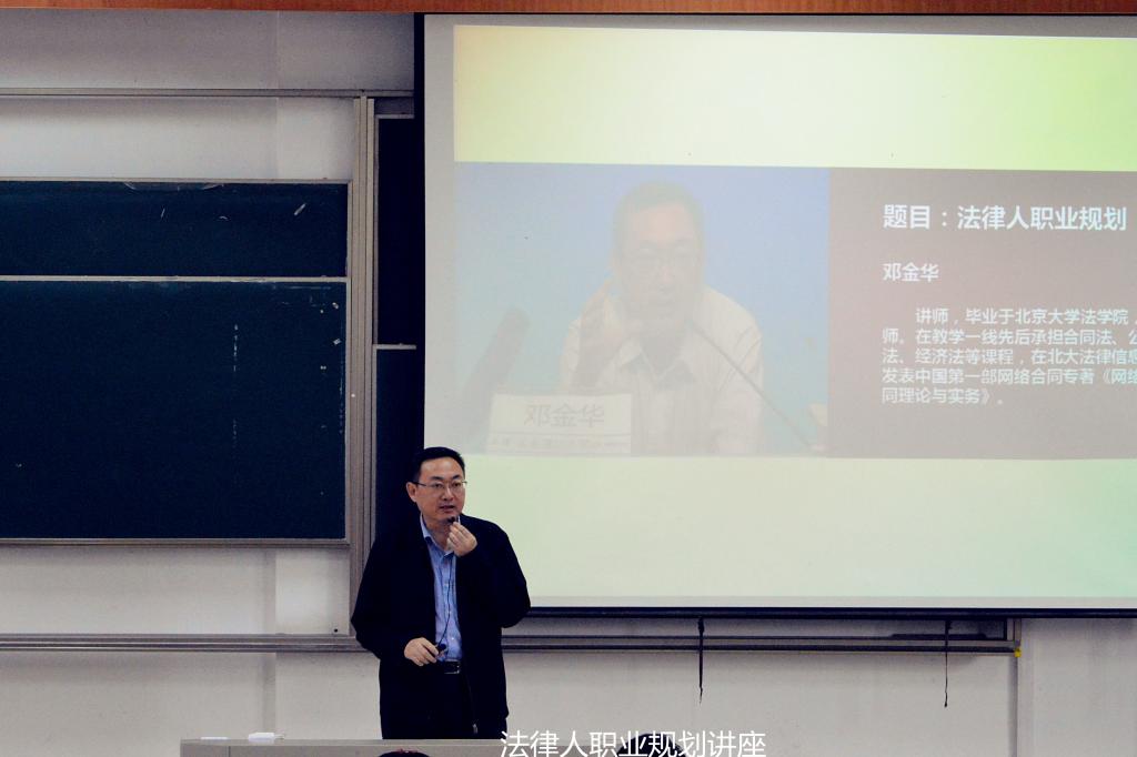 邓金华老师毕业于北京大学法学院,在教学一线先后承担合同法、公司法、经济法等课程,教学经验丰富。讲座一开始,邓老师便从我国依法治国理念入手,说明了国家对法学人才需求的紧迫性和重要性,阐述法学专业的广阔前景,解析法律学子的职业规划现状。