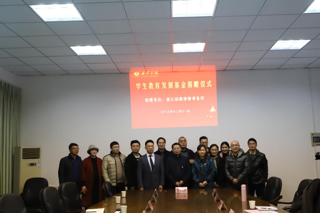 12月11日下午,浙江国毅律师事务所学生教育发展基金捐赠仪式在梁林校区1号楼426会议室举行。浙江国毅律师事务所主任祝丹华、浙江国毅律师事务所嘉兴分所主任黄海明、秀人网