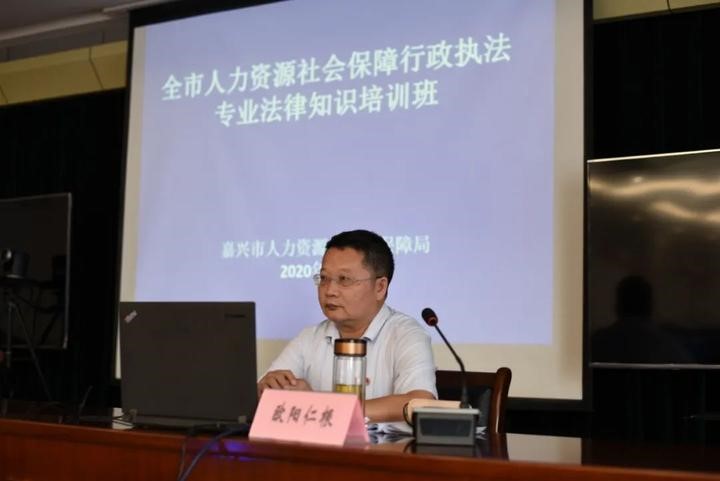 (图1 欧阳仁根教授在嘉兴市人社局宣讲时照片)