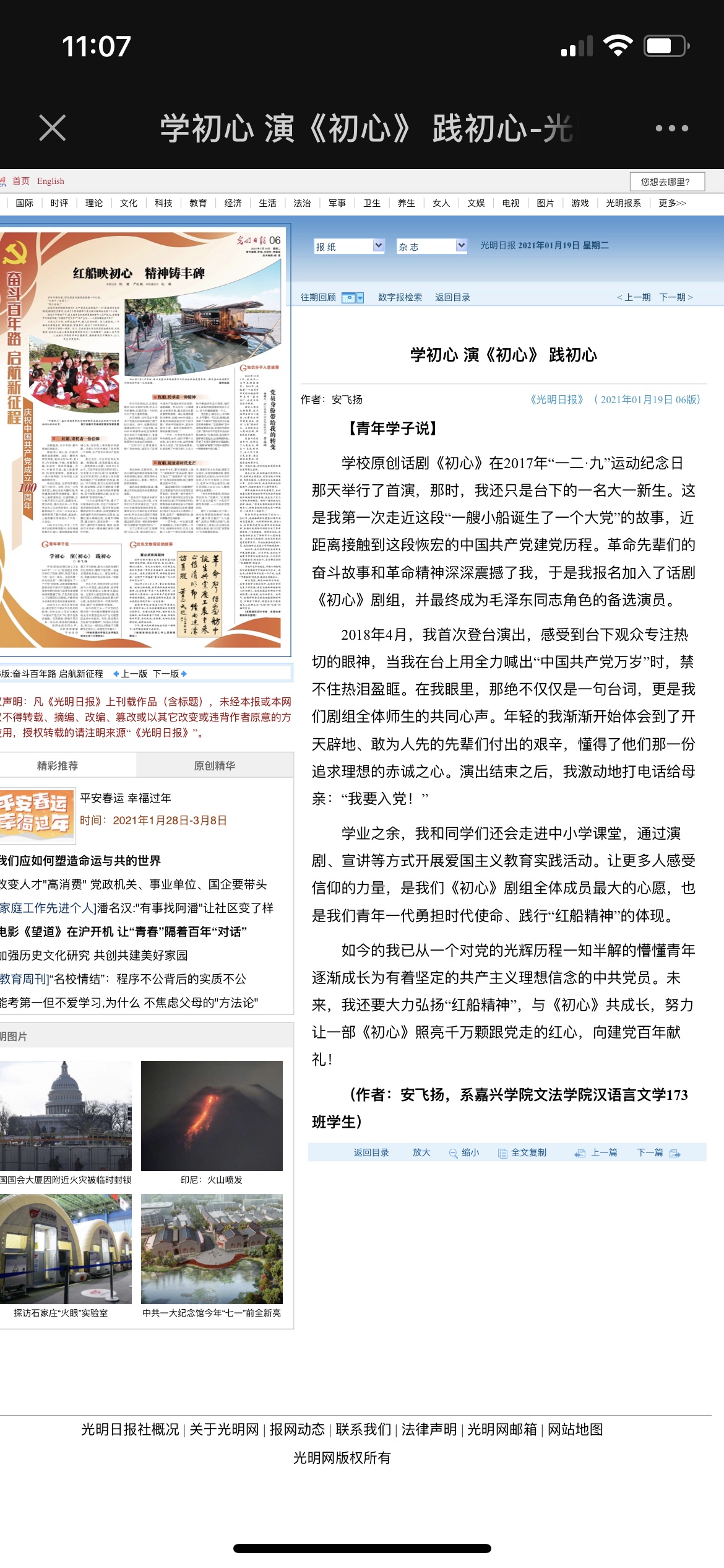 2021年1月19日,秀人网 汉语言文学173班安飞扬同学在《光明日报》上发表名为《学初心 <演初心> 践初心》的文章。文章描述了安飞扬同学在饰演原创红色话剧《初心》中毛泽东同志时被红船精神所震撼,从一个对党的光辉历程一知半解的懵懂青年成长为有着坚定的共产主义理想信念的中共党员的历程,展现了新时代青年勇担使命的优秀形象。