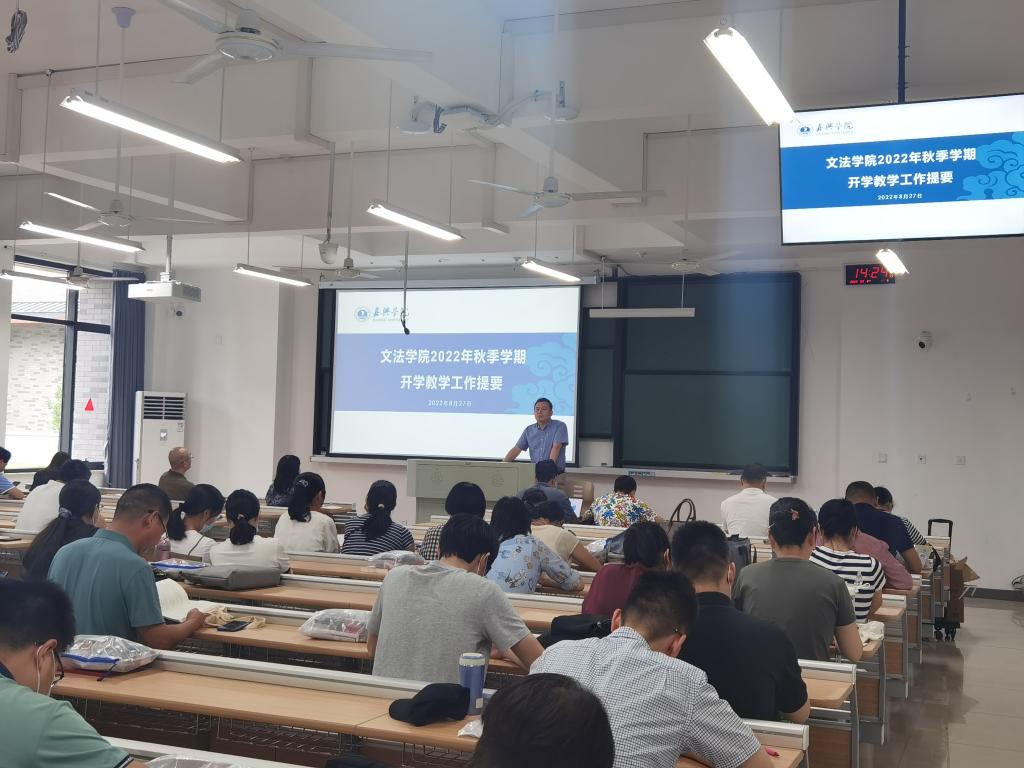 在厚德楼122教室召开新学期第一次全体教职工会议。会议由党委书记洪坚主持。