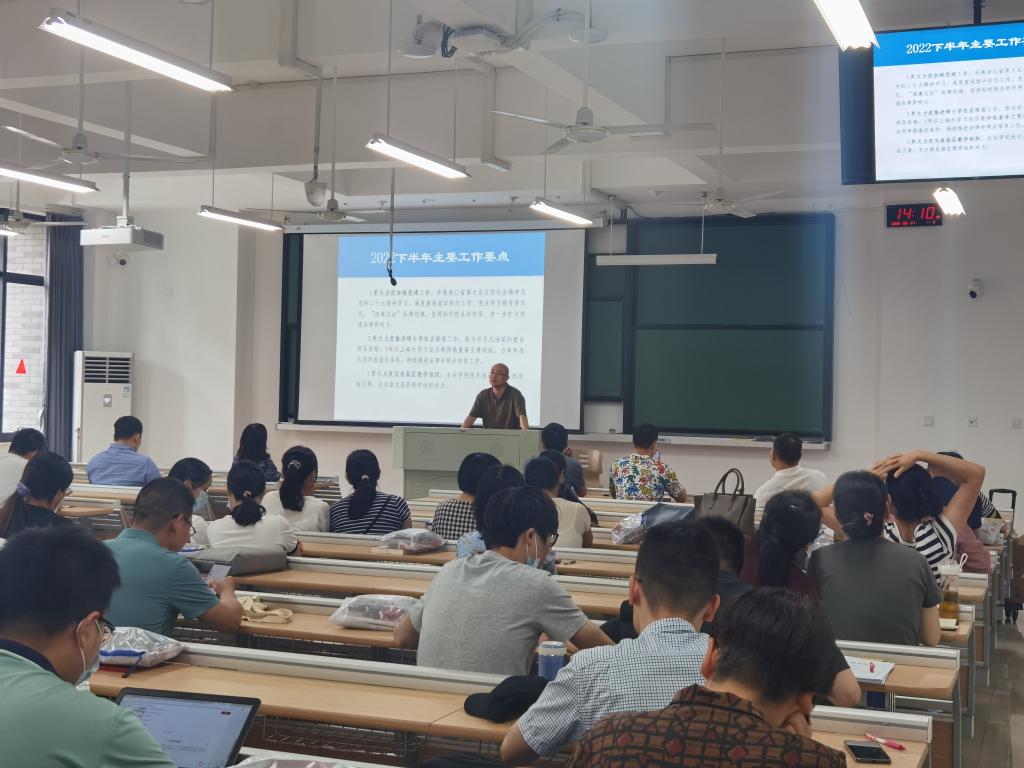 会上,童建华副院长(主持工作)就2022年上半年学院工作进行了总结回顾,并对下半年重点工作进行了布置。洪坚书记传达了学校暑期中层干部读书会有关精神,带领全体教职工学习了《干在实处勇在潮头——习近平浙江足迹》、吴岩司长《 打造“金专”“金课”,锻造中国“金师”》、习近平在省部级主要领导干部专题研讨班上的讲话精神等内容,并对下一步《习近平谈治国理政》第四卷学习、学院党建工作及疫情防控常态化等工作进行部署。屈正林副院长对新学期开学教学准备、留学生教学工作、2022届毕业生论文抽检等工作进行了详细的讲解及安排。