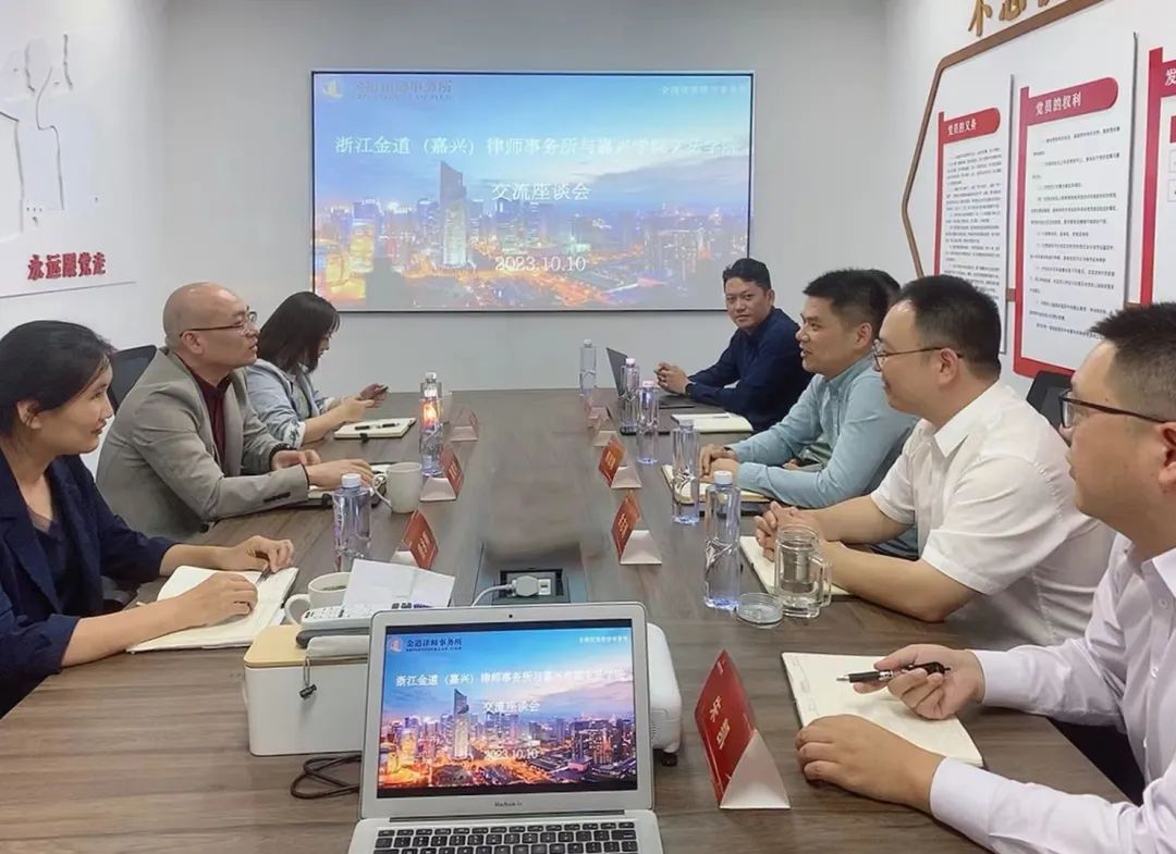 副院长(主持工作)童建华、党委副书记虞岚、法学系主任唐永梅一行到浙江金道(嘉兴)律师事务所调研学习。金道嘉兴分所主任陈建刚,副主任金志海,律师朱凯、尹峰峰,顾问丁善超等参与座谈。