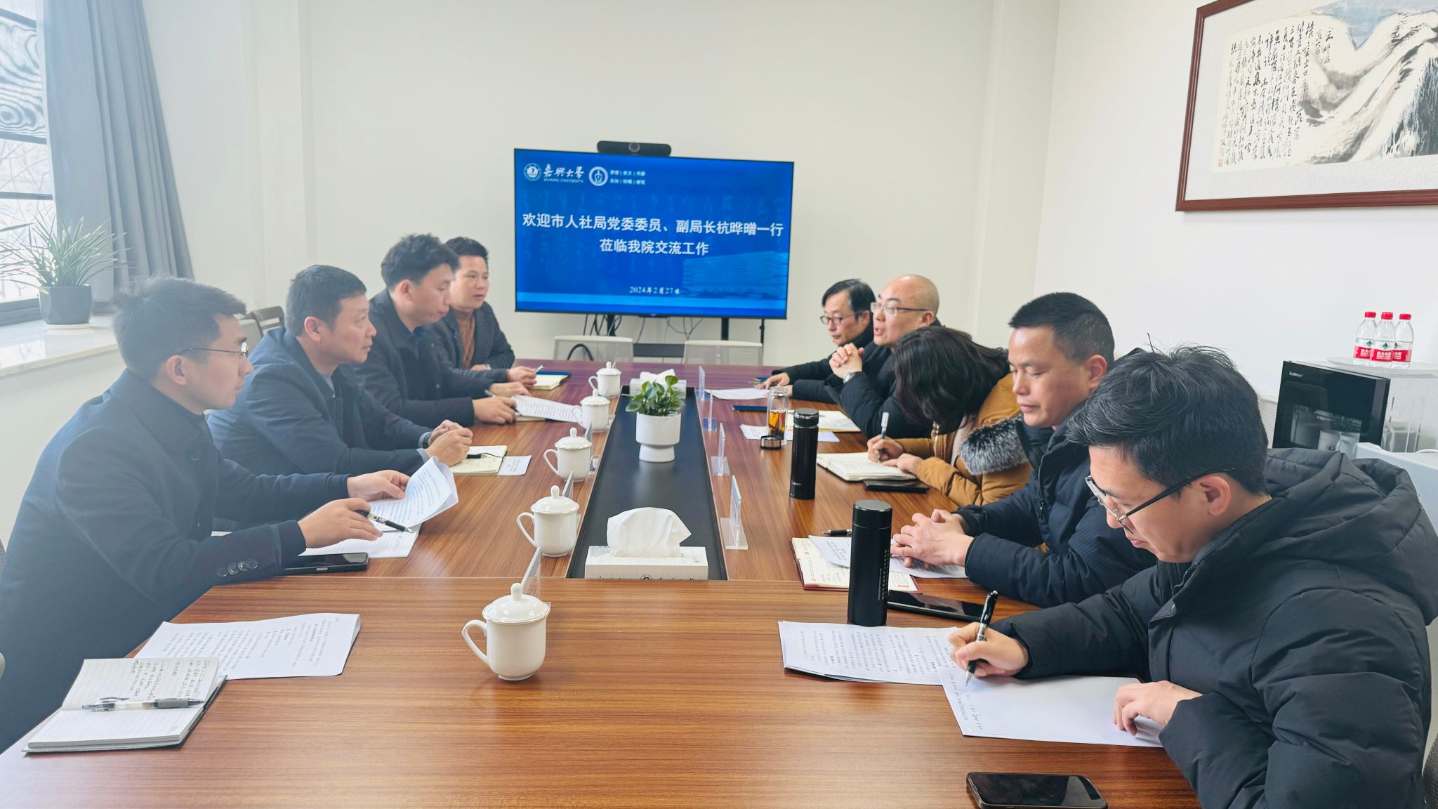 2月27日上午,嘉兴市人社局党委委员、副局长杭晔㬝一行5人来秀人网 交流工作。会议由学院党委书记童建华主持,法学系主任唐永梅,副主任杨永磊,法学系教师周述荣等参加座谈交流。