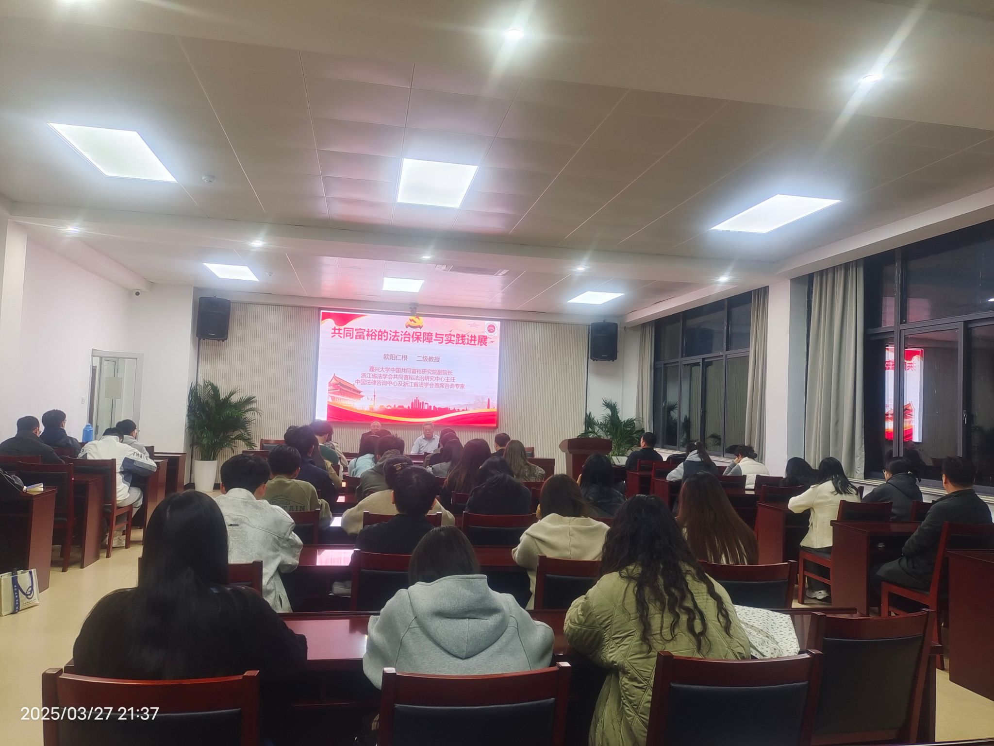 参加研讨会期间,欧阳仁根教授为安财法学师生做了一次题为“共同富裕的法治保障与实践进程”的讲座。欧阳仁根教授阐述了共同富裕作为社会主义本质要求和中国式现代化特征的重要意义,强调其涵盖物质与精神双重富裕,体现社会公平正义。他指出,实现共同富裕需完善法治体系、推进重点立法、深化执法司法改革,并结合浙江实践,展示了法治建设对共同富裕示范区的推动作用。本次讲座内容详实、案例生动,为同学们打开了一扇了解社会发展的新窗,指引同学们为实现共同富裕的美好愿景贡献青春力量。