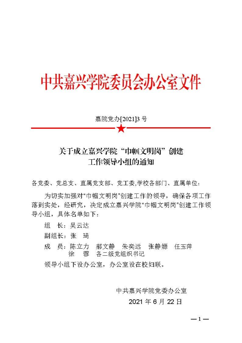 关于成立嘉兴学院“巾帼文明岗”创建工作领导小组的通知