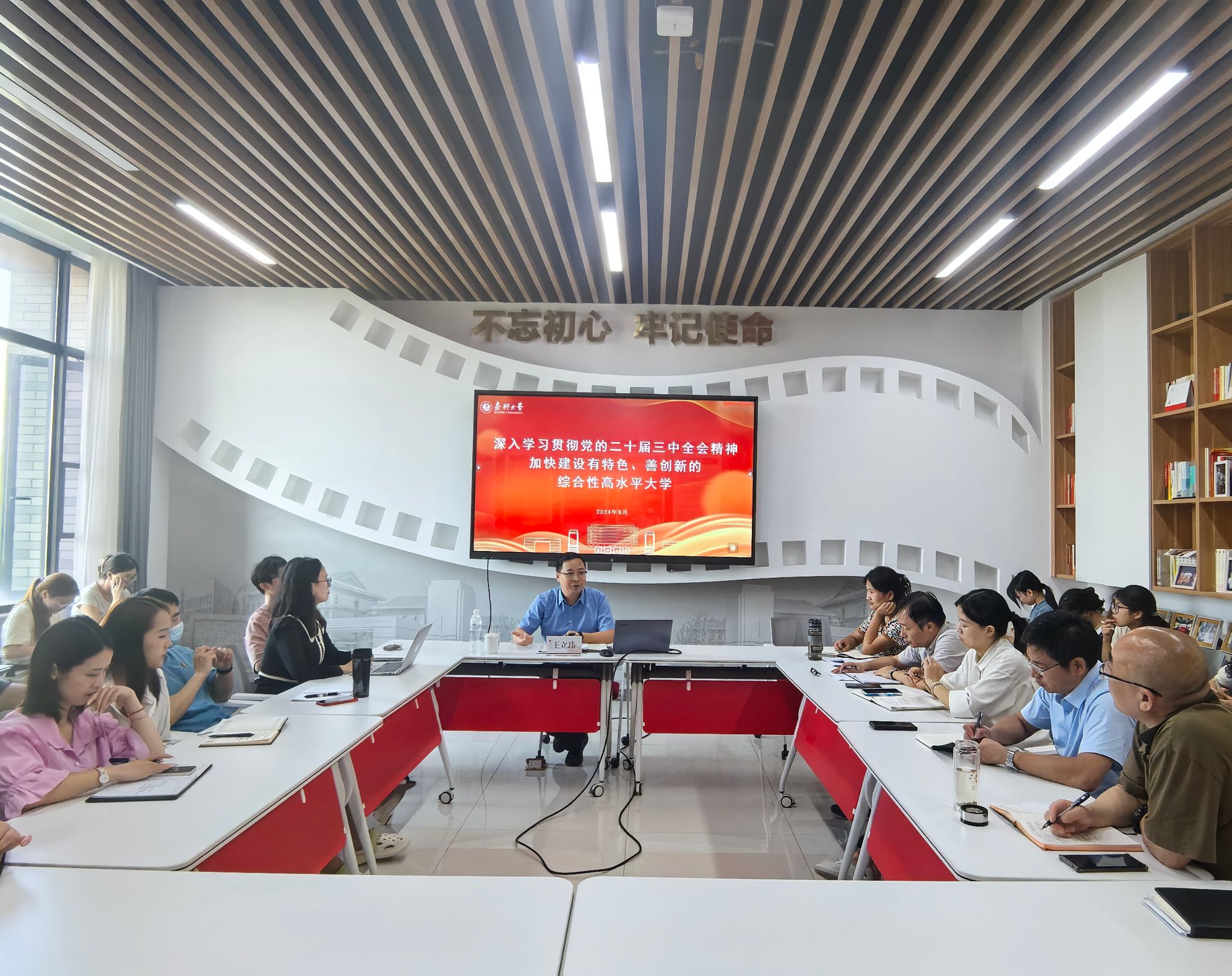王立玮以《深入学习贯彻党的二十届三中全会精神加快建设有特色、善创新的综合性高水平大学》为题,对党的二十届三中全会精神进行了全面解读。以党的二十届三中全会的历史地位为切入点,结合国内国际近期的时事政治,深刻阐述了进一步全面深化改革的重大意义,同时结合省委十五届五次全会精神,强调要结合工作实际,把握进一步全面深化改革的各项重点任务,特别是在教育、科技、人才领域教师要承担的责任和使命,每位教职工都要在落实立德树人根本任务中担当尽责,力争到2035年实现“冲A、拼‘博’、创一流”的奋斗目标,为推动学校事业高质量发展贡献文法力量。